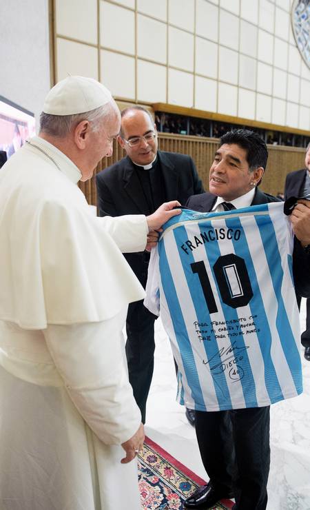 Diego Armando Maradona presenteia o compatriota Papa Francisco durante uma reunião com organizadores, jogadores e convidados do jogo inter-religioso "jogo pela paz", no salão Paulo VI, no Vaticano Foto: HANDOUT / AFP - 25/11/2020